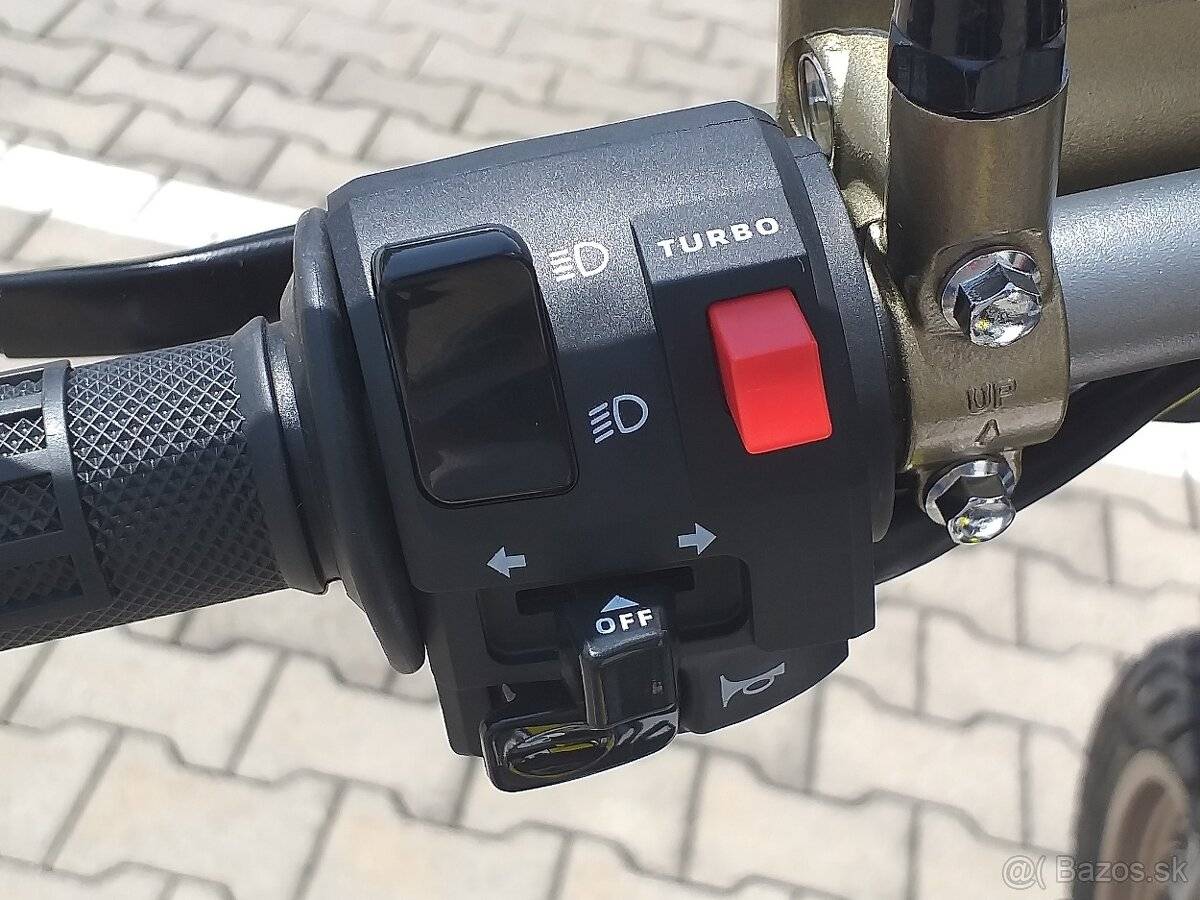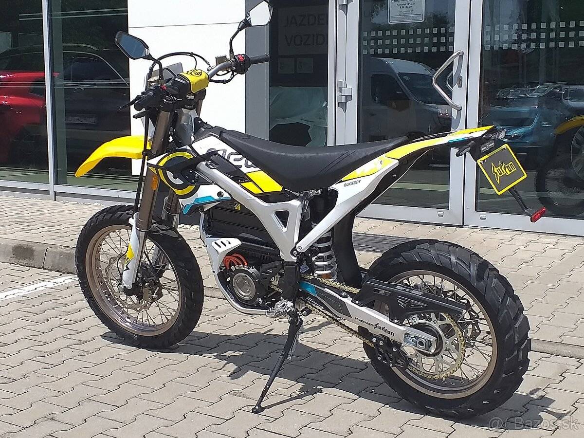 Cenníková cena 9 890€ s DPH – Cena po zľave 7 990€ s DPH ( zľava 1 900€) Typ motora – vysokovýkonným bezkomutátorovým (BLDC) elektromotoro Napätie – 104 V (DC) Predpísaný výkon / Max. výkon – 10 000 W / 22 500 W Točivý moment – 520 Nm (na zadnom kolese) Najvyššia rýchlosť- 110 km/h Maximálny dojazd – 120 km @ 50 km/h v závislosti na terénu) Batéria – 104 V / 55 Ah Lithium Ion Nabíjačka – 10A Doba nabíjania – 4 hodiny (0–100 %) Hnacia reťaz 530 s O-krúžkom Predné odpruženie – 47 mm obrátená vidlica, zdvih 290 mm, nastaviteľná kompresia a odskok Zadné odpruženie – Plne nastaviteľný tlmič, zdvih kolesa 290 mm Predné koleso – 18″ Ráfik – drôtený lúč terénna pneumatika 80/100-21 Zadní kolo- 18″ Ráfik – drôtený lúč terénna pneumatika 100/90-18 Pohotovostná hmotnosť – 127 kg Maximálne zaťaženie – 100 kg Rozmery – 2.080 mm x 805 mm x 1 240 mm Minimálna svetlá výška – 310 mm Výška sedadla – 975 mm Rázvor kolies – 1430mm Napájací systém – Mid-drive BLDC motor + FOC sínusový kontrolér Maximálny výkon – 22.5 KW Typ batérie – 104V/55Ah lítium-iónová vymeniteľná batéria Materiál rámu – vysokopevná kovaná hliníková zliatina Režim jazdy – Eco / Rain / Sport mode / Turbo mode / Spätný chod R